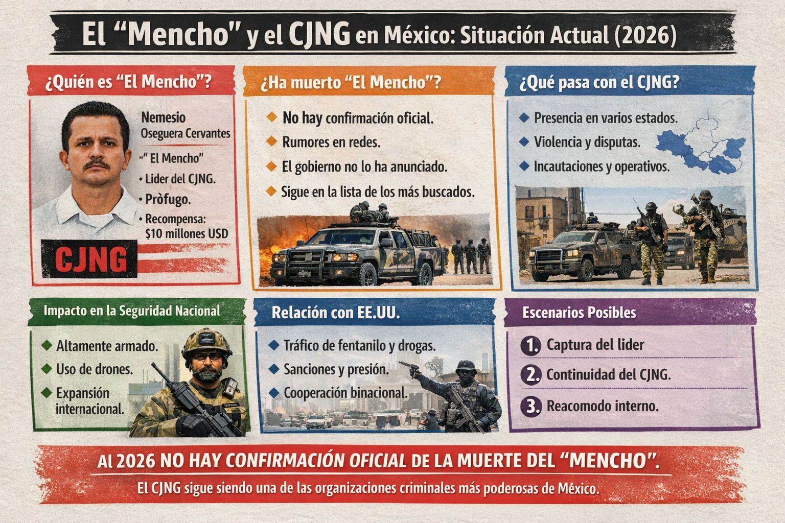 Infografía didáctica sobre la situación actual de Nemesio Oseguera Cervantes, alias “El Mencho”, y el Cártel Jalisco Nueva Generación (CJNG) en 2026. Análisis de los rumores sobre su muerte, el impacto en la seguridad nacional y los escenarios posibles en México.